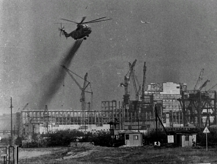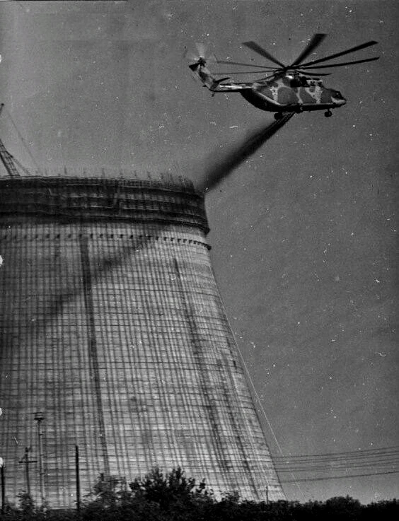 Ми-26 пролетает вокруг территории ЧАЭС, послеаварийное фото. https://t.me/chernobyl_pripyat/4699